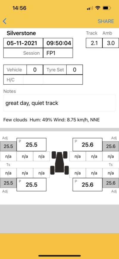 - Temperatures from inner, middle and outer section of each tyre, with track and ambient temperature